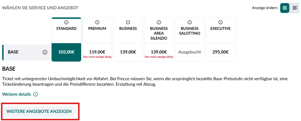 Standard: Vergleichbar mit der 2. Klasse.Premium: 1. Klasse in 2–2 Bestuhlung. Im Frecciarossa 1000 inkl. Welcome-Drink und Snacks (außer samstags). Ein FIP-Ausweis für die 1. Klasse wird benötigt.Business: 1. Klasse in 2–1 Bestuhlung. Im Frecciarossa 1000 inkl. Welcome-Drink und Snacks (außer samstags). Nicht mit FIP buchbar.Executive: Luxusklasse mit privatem Abteil für 10 Personen und zusätzlichem Meetingraum. Nicht mit FIP buchbar.